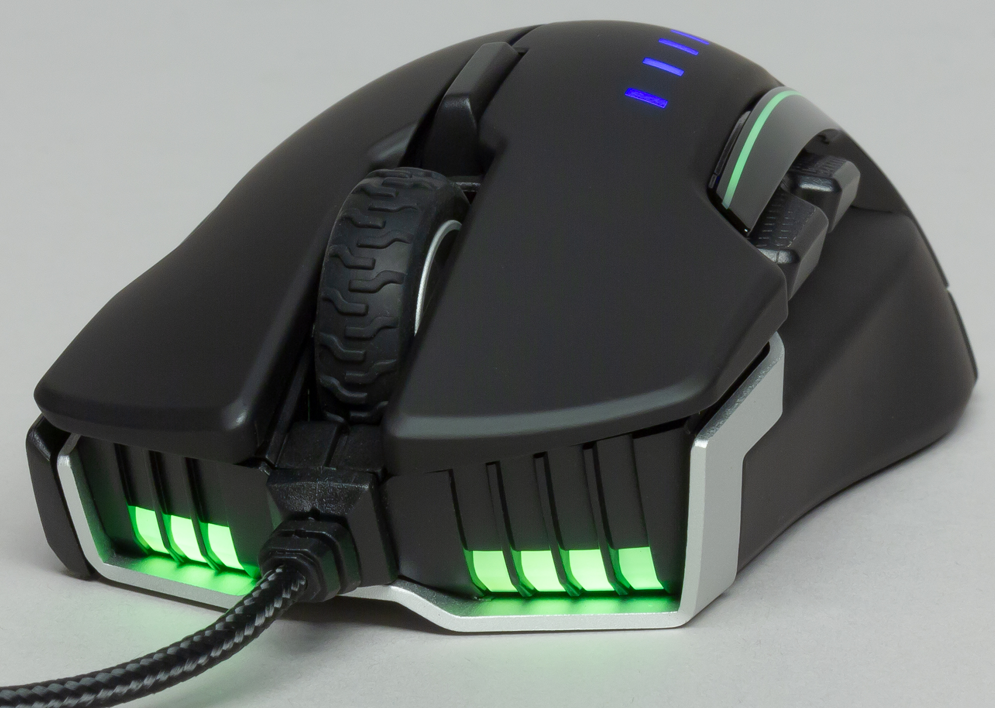 На левой половине верхней панели расположена светодиодная шкала индикации переключения пресетов CPI. Деления подсвечены синим цветом.