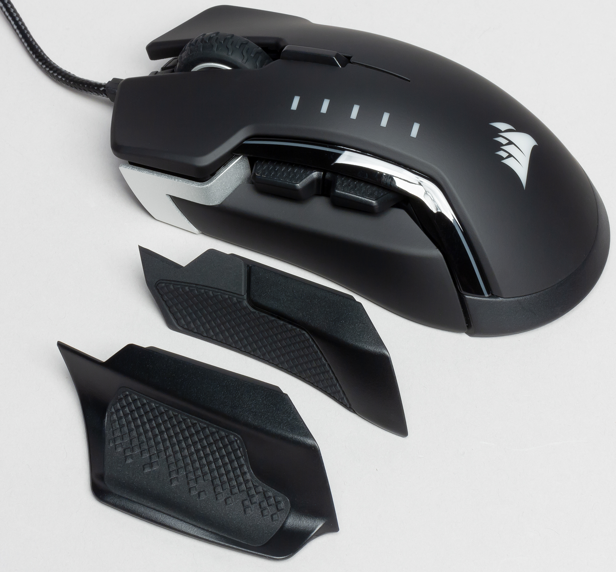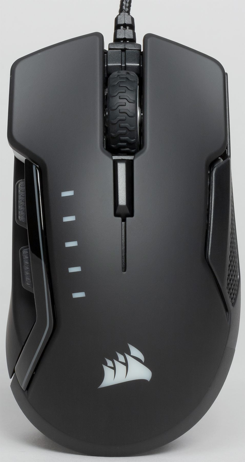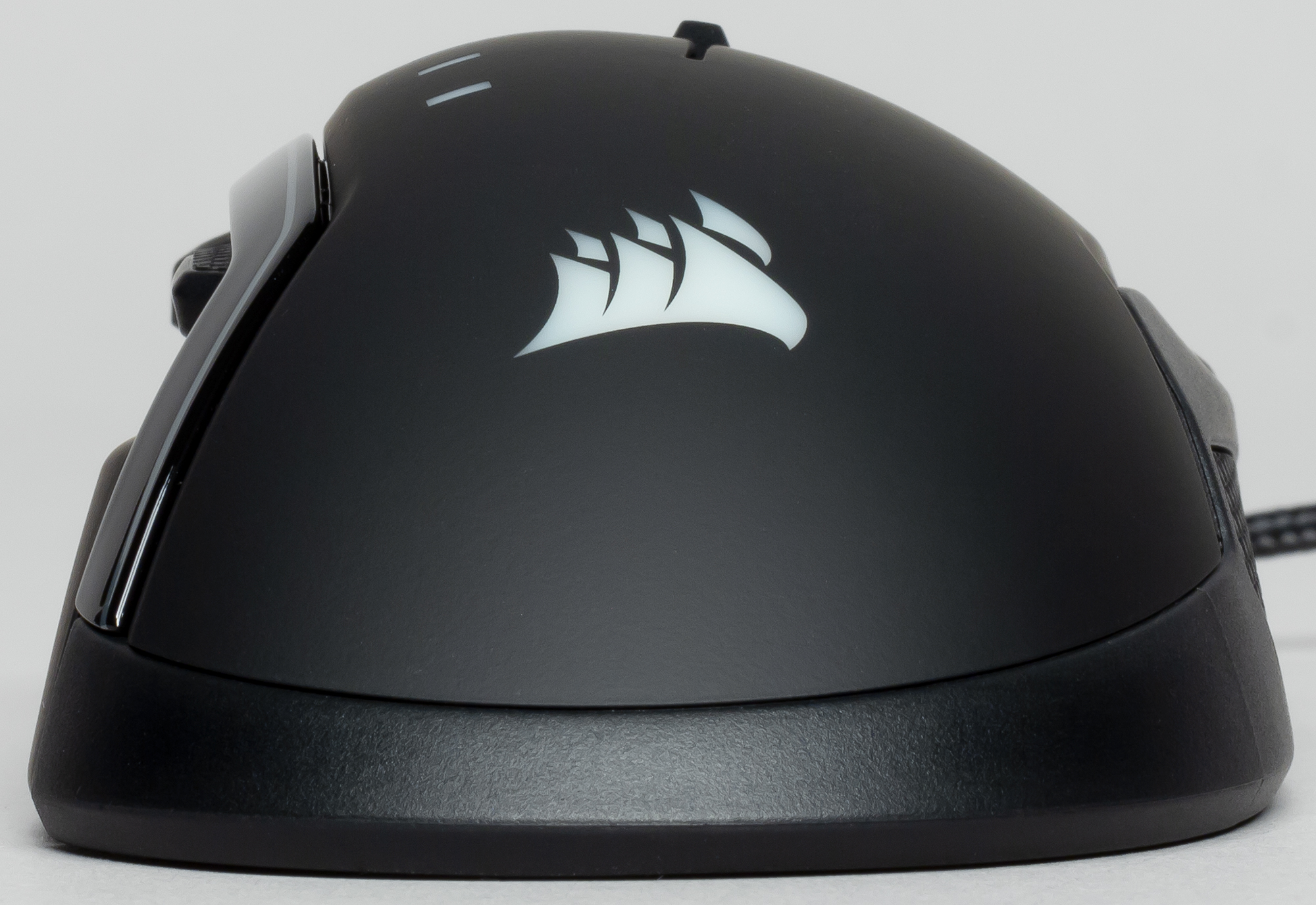 На тыльной стороне верхней панели находится одна из трёх зон RGB-подсветки устройства — логотип Corsair. С левой и правой стороны верхняя панель обрамлена светящимися полосками, а ещё одна зона, состоящая из двух светодиодов, расположена на передней панели мышки.