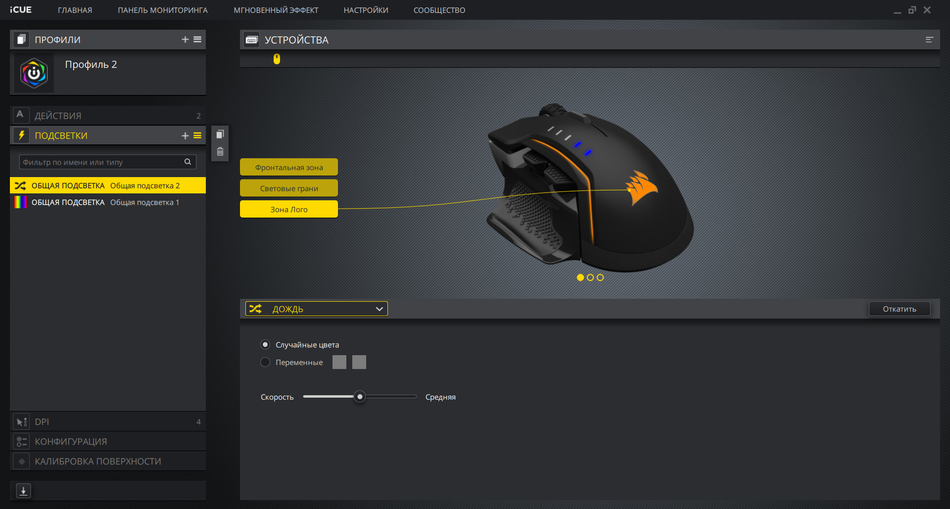 В случае с Corsair Glaive RGB никаких особых эффектов подсветки настроить не получится, в устройстве всего 5 светодиодов, разделённых на 3 зоны. Диоды внутри зоны — не адресуемые, зона настраивается целиком.