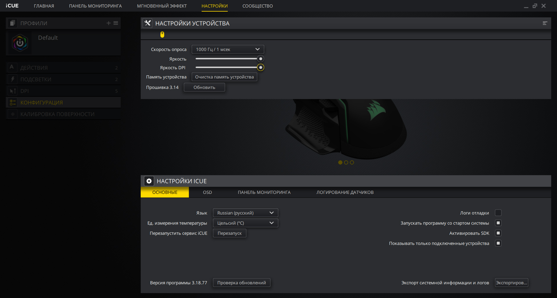 Помимо этого можно регулировать частоту опроса. Также есть ползунок яркости подсветки, но он работает только в двух режимах — подсветка есть и подсветки нет. А вот ползунок яркости индикатора CPI имеет несколько промежуточных значений.