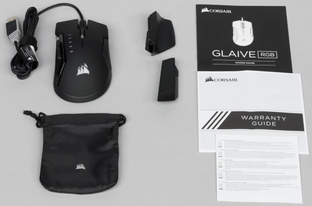 Манипулятор Glaive RGB поставляется в небольшой коробке традиционной для Corsair расцветки в чёрных и жёлтых цветах. Фронтальную панель можно открыть, как открытку, чтобы рассмотреть мышь через блистер. В комплект поставки входит руководство пользователя, мешок для транспортировки из мягкой чёрной ткани и две сменные панели для левого бока мыши.