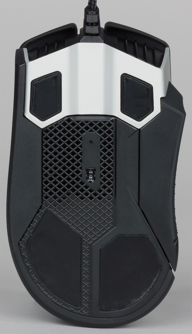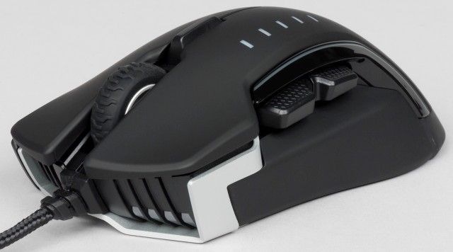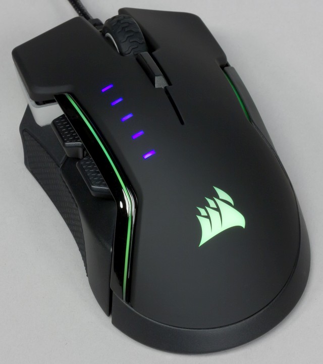 На ближайшей к пользователю части манипулятора размещён логотип Corsair, который при подключении Glaive RGB к ПК начинает светиться разными цветами радуги. Чуть выше находится кнопка переключения профилей. Всего их пять, а индикатором выбранного профиля являются светодиоды синего цвета, которые находятся слева от этой кнопки. Подсвеченное число индикаторов соответствует номеру выбранного профиля. Ещё левее индикаторов по краю мышки, на границе со съёмной панелью расположен тонкий вырез, прикрытый полупрозрачным пластиком, который, как и логотип, подсвечивается разными цветами при подключении к ПК. Такой штрих от дизайнера выглядит элегантно.