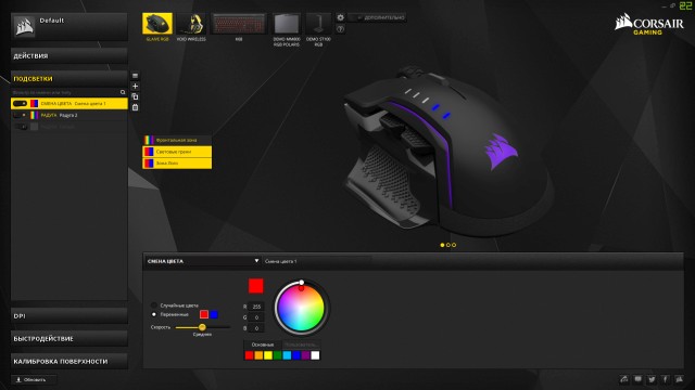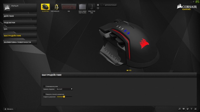 В последние месяцы внешний вид CUE претерпел изменения. Теперь все подключенные устройства располагаются в верхней правой части приложения, в том числе там же отображаются устройства, которых у вас нет, но которые могут быть, такое ненавязчивое напоминание о широком модельном ряде. Выберем из ряда Glaive RGB и посмотрим, какие настройки нам доступны. Пользователь может создать, изменить и назначить макрос, тонко настроить чувствительность сенсора, указать тип поверхности скольжения, изменить высоту отрыва от поверхности и настроить цвет и режим работы подсветки и т. д.