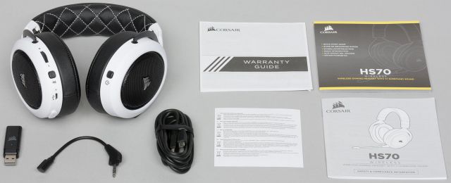 Гарнитура продаётся в картонной коробке, оформленной в традиционных для Corsair цветах. Внутри, кроме собственно наушников, в специальном пластиковом отсеке размещены: микрофон на гибкой штанге, трансмиттер радиосигнала, кабель USB для зарядки аккумулятора в гарнитуре, руководство пользователя и информация об условиях гарантии.