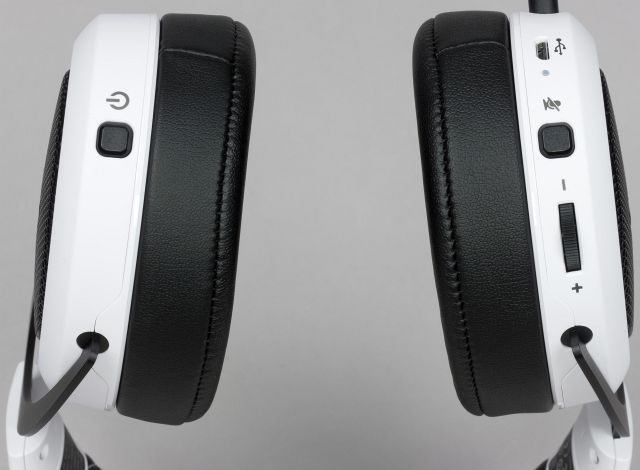 Снизу правой чашки расположена кнопка включения, которая срабатывает при нажатии и удержании. Это исключает случайное нажатие. На левой чашке размещены: колесо регулировки уровня громкости, кнопка отключения микрофона, порт microUSB для зарядки аккумулятора, светодиодный индикатор статуса и порт для подключения штанги микрофона, который можно прикрыть пластиковой заглушкой белого цвета.