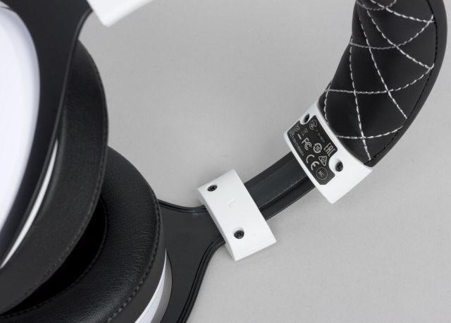 Чашки наушников крепятся к оголовью металлическими вилками чёрного цвета. Внимания заслуживают тонкие провода, проложенные по краям вилок в незаметных каналах. В результате гарнитура выглядит изящно, никакие провода не торчат. В целом дизайн и чёрно-белое цветовое оформление выглядят стильно и строго.