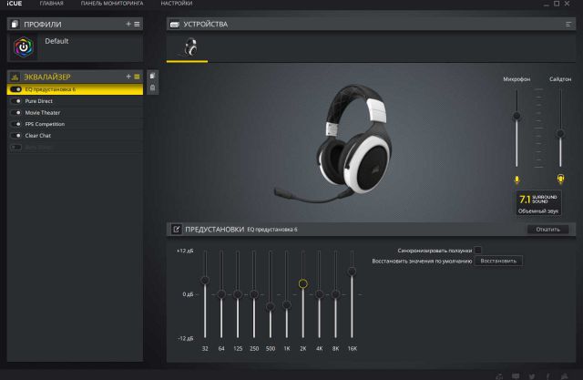 В iCUE можно выставить настройки, как на скриншоте выше, пресет прошивается в ППЗУ наушников и потом действует на все приложения.