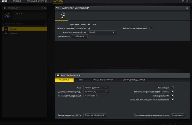 Во вкладке «Настройки» можно активировать голосовое оповещение о смене статуса гарнитуры (на английском языке): отключение микрофона, активация виртуального многоканального звука, смена профиля или настроек эквалайзера. В этой же вкладке можно обновить прошивку устройства, изменить режим автовыключения и изображение устройства в iCUE.