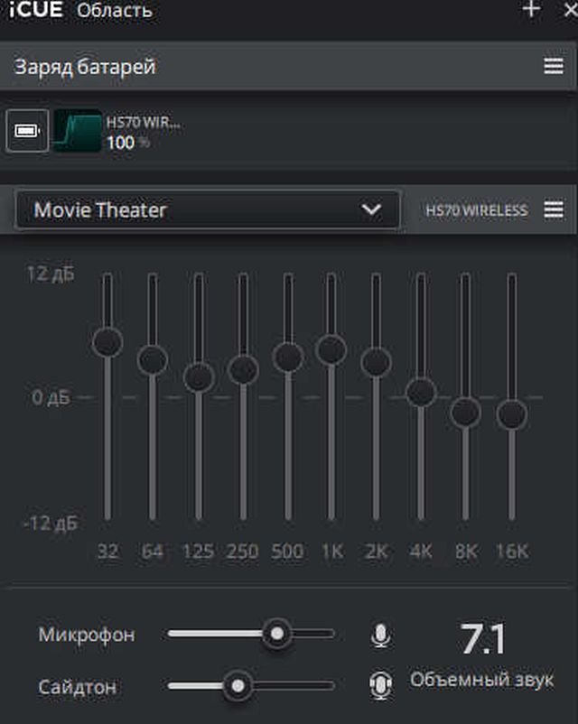 Пользователь может вывести постоянное вертикальное окно iCUE справа, где можно оперативно изменять режим эквалайзера, управлять микрофоном, активировать виртуальный многоканальный звук и видеть уровень заряда аккумулятора.