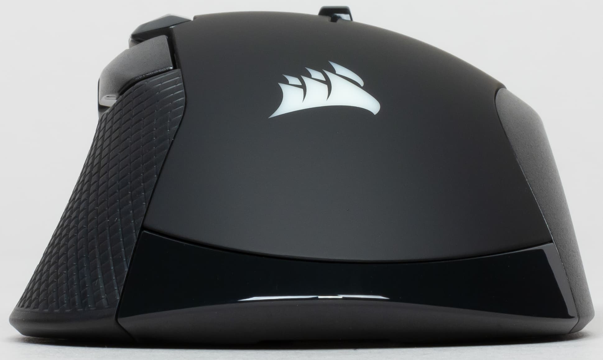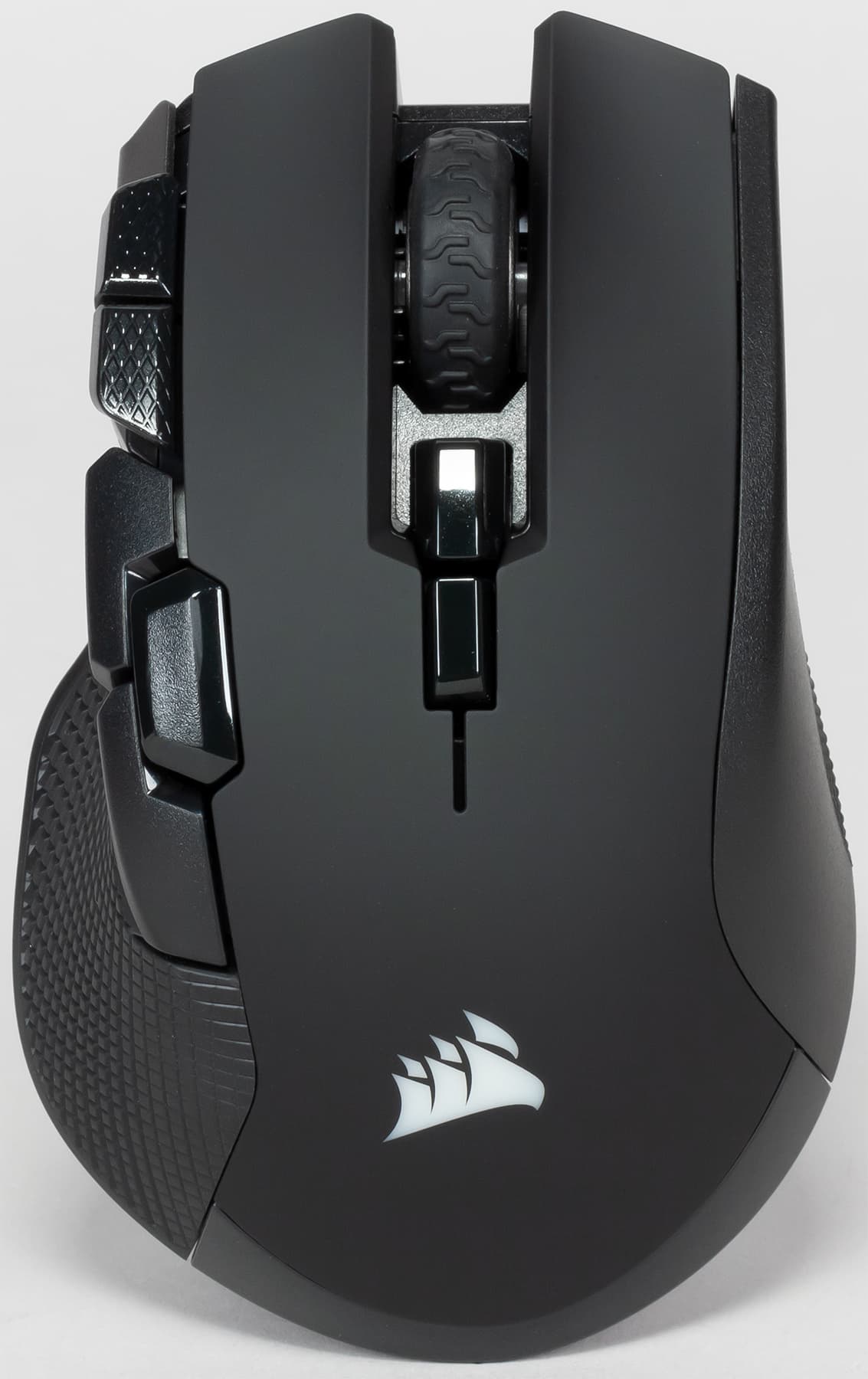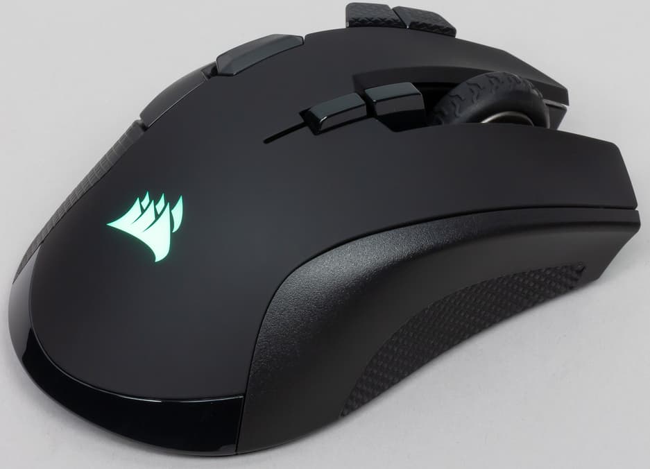 Подсветки здесь больше, чем у проводной модели. Кроме логотипа и подсветки колеса, добавили ещё и «фары», как у модели Glaive от тех же Corsair. Светодиода, призванного подсвечивать колёсико, практически не видно. Знакомая нам корпусная панель из металла тоже присутствует — это фигурная деталь из серого матового металлического сплава, частично закрывающая корпус спереди. В проводной Ironclaw такого не было, а тут, видимо, решили до конца оправдать название. Подобное решение мы опять-таки встречали в Glaive. Скорее всего, эта панель служит дополнительным утяжелителем.