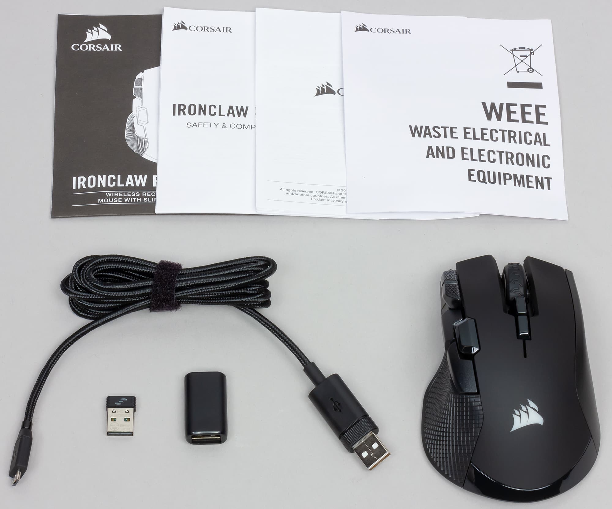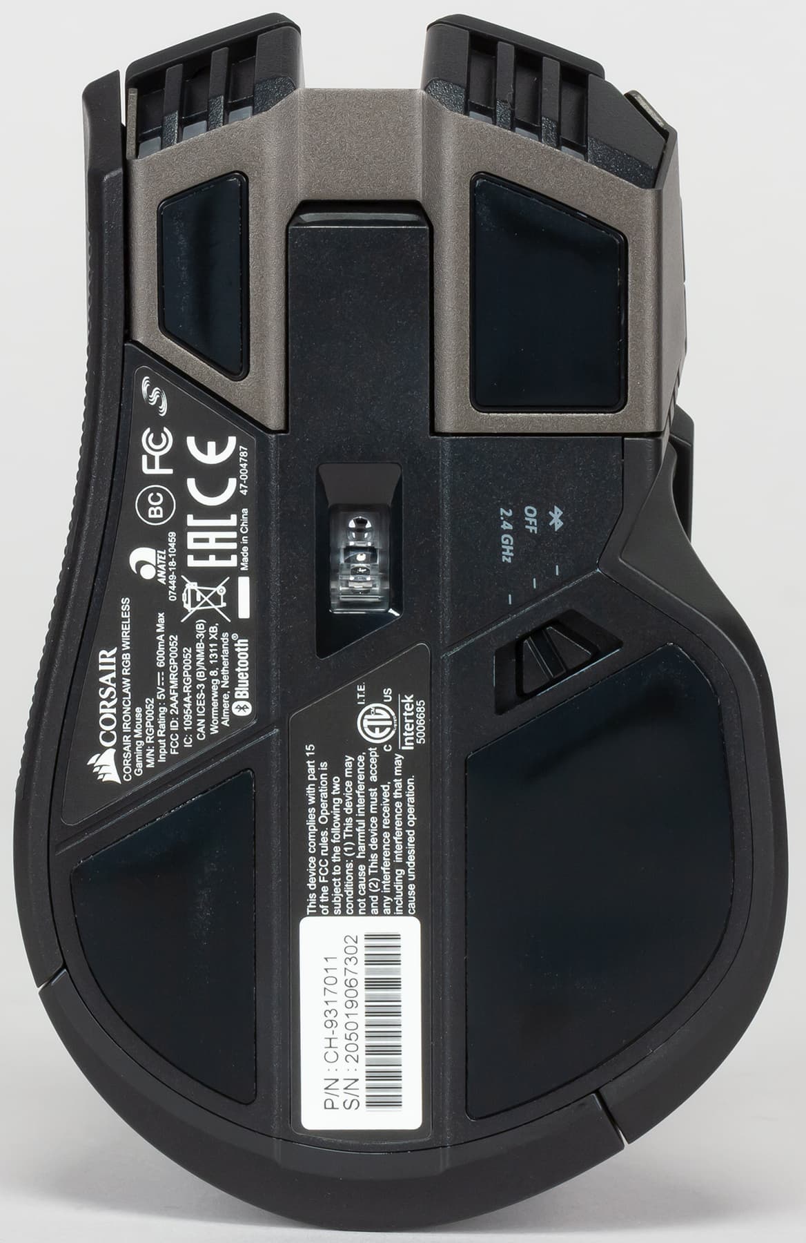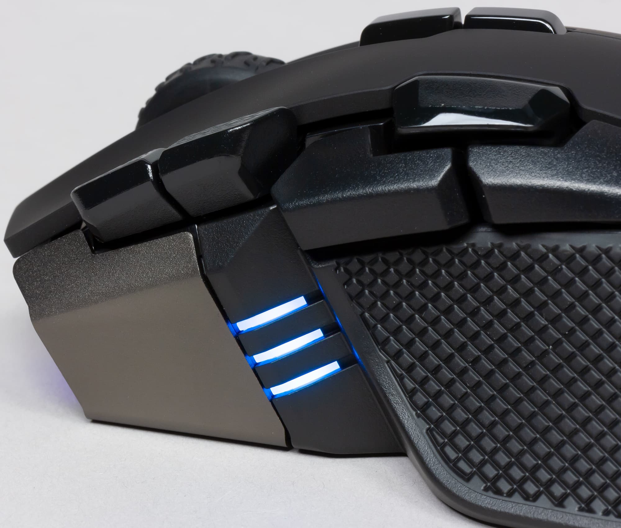 Подсветки здесь больше, чем у проводной модели. Кроме логотипа и подсветки колеса, добавили ещё и «фары», как у модели Glaive от тех же Corsair. Светодиода, призванного подсвечивать колёсико, практически не видно. Знакомая нам корпусная панель из металла тоже присутствует — это фигурная деталь из серого матового металлического сплава, частично закрывающая корпус спереди. В проводной Ironclaw такого не было, а тут, видимо, решили до конца оправдать название. Подобное решение мы опять-таки встречали в Glaive. Скорее всего, эта панель служит дополнительным утяжелителем.