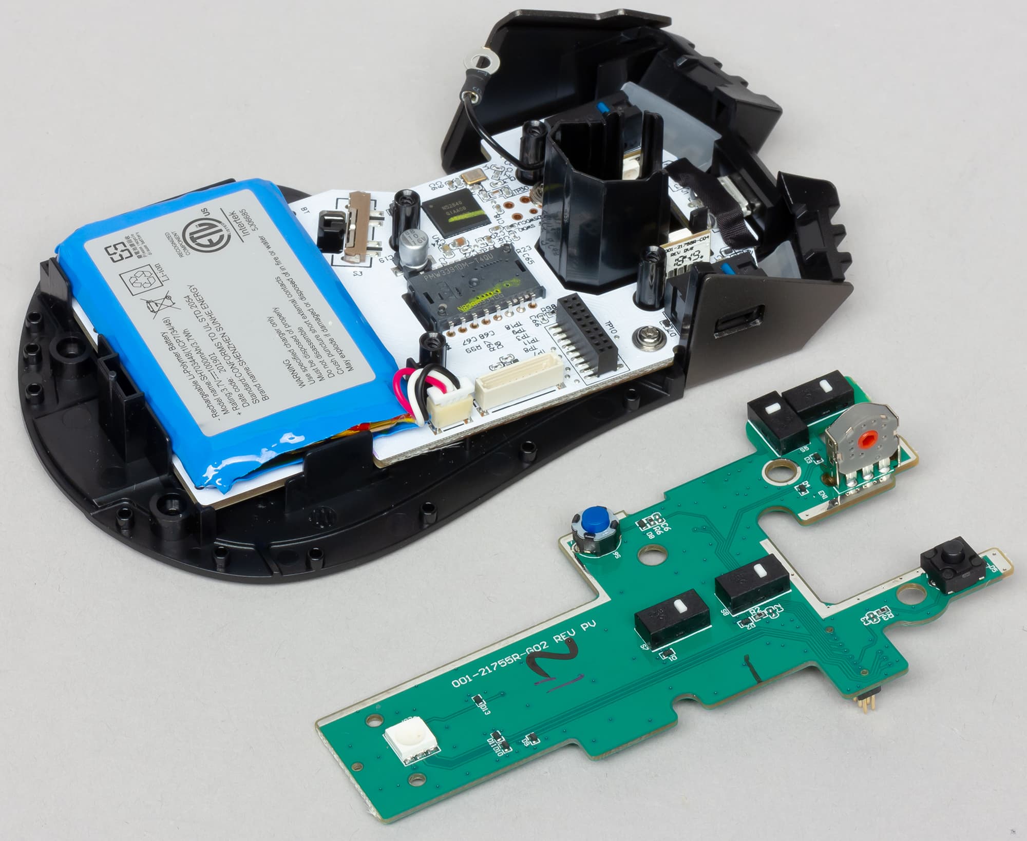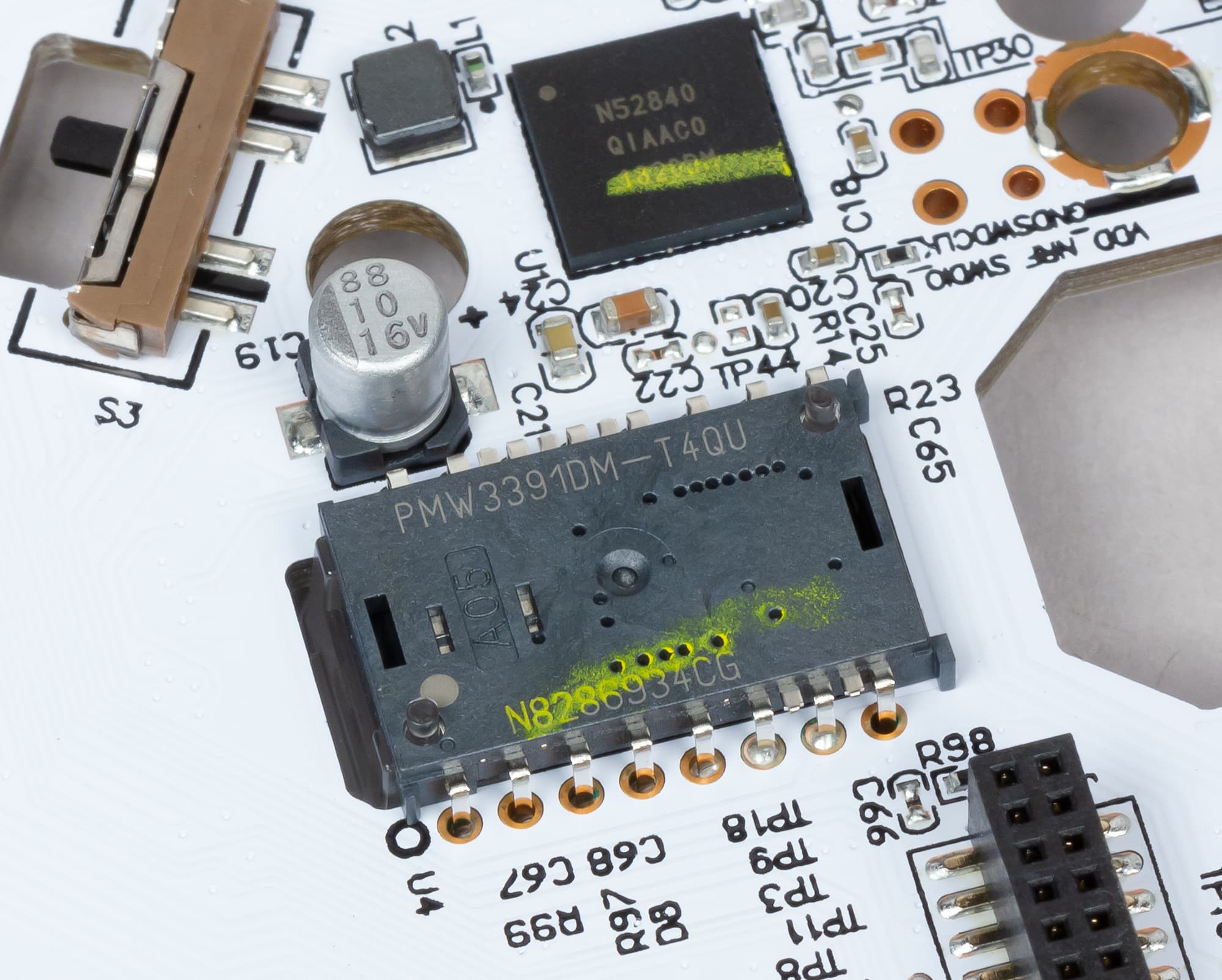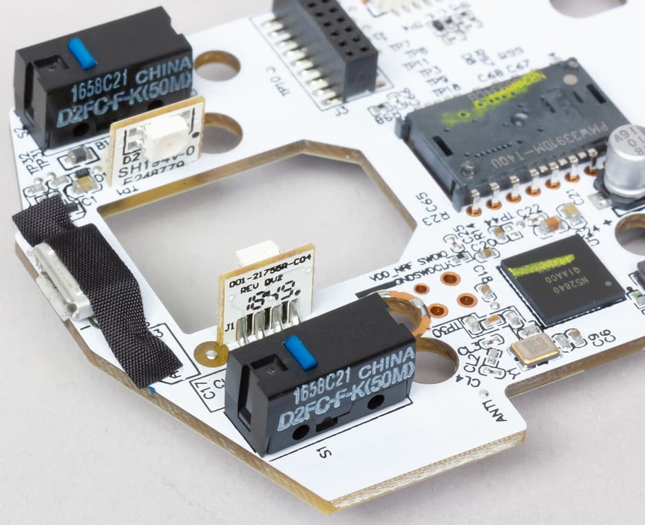 В манипуляторе стоит один из топовых на сегодняшний день сенсоров — PixArt PMW 3391 с разрешением до 18 000 DPI и потенциальным ускорением до 50G.