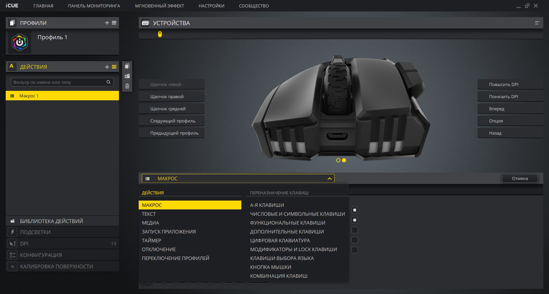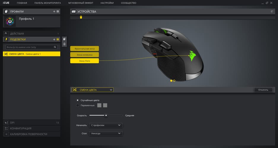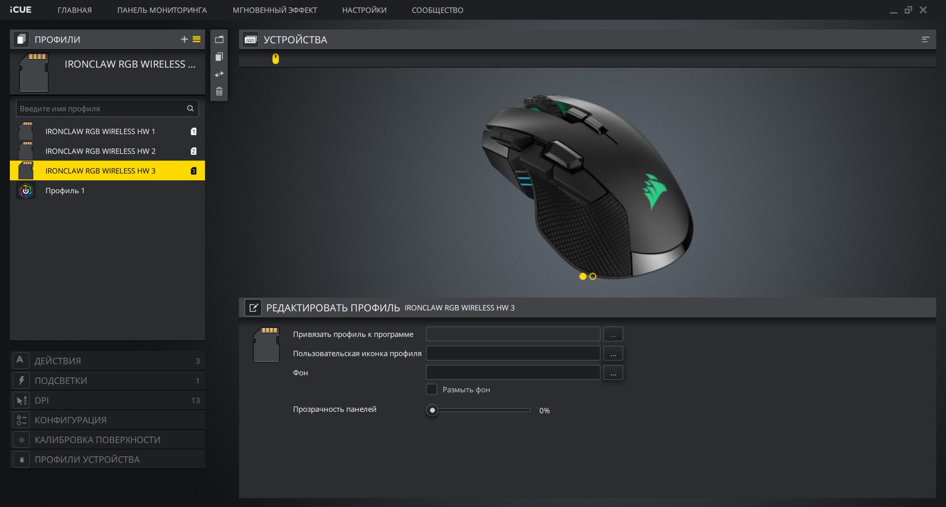 Мышь Ironclaw RGB Wireless, как и вся периферия Corsair, настраивается через фирменное по iCUE. Причём встроенная память мыши позволит записать три профиля, и если этого достаточно, то программу можно удалить — мышь будет работать так, как её настроили, включая режимы подсветки и макросы. Если же трёх профилей мало, то можно создать пару сотен дополнительных, но храниться они, соответственно, будут только на вашем компьютере.