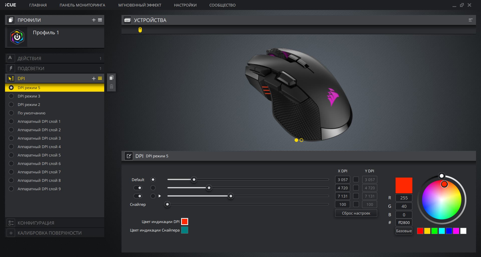 Во вкладке настроек чувствительности пользователю предлагается выбрать значения для трёх режимов DPI (четвёртый — «снайперский») в рамках одного профиля. Три режима это, конечно, не очень много, но этот недостаток компенсируется возможностью переключения профилей. Также здесь можно поменять цвет индикатора.