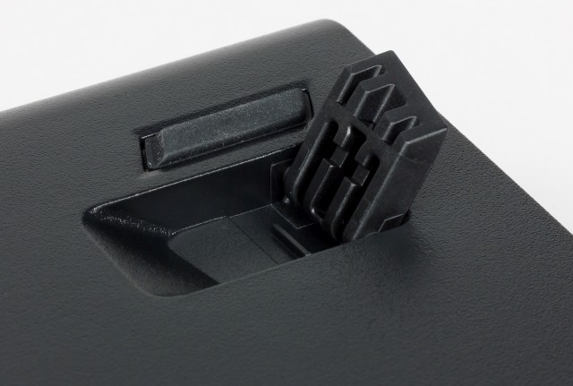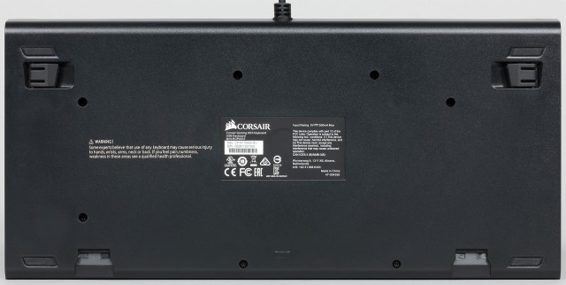 Помимо откидных ножек, на днище по углам размещены четыре резиновые полоски, предотвращающие скольжение клавиатуры по столу.