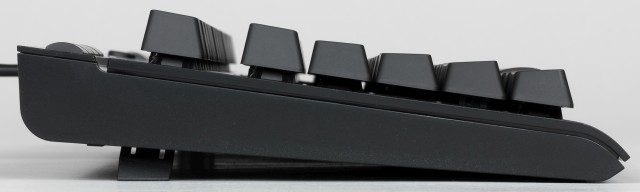 На днище клавиатуры расположены две откидные ножки, позволяющие изменять угол наклона к поверхности стола на 10-15 градусов.
