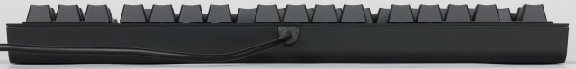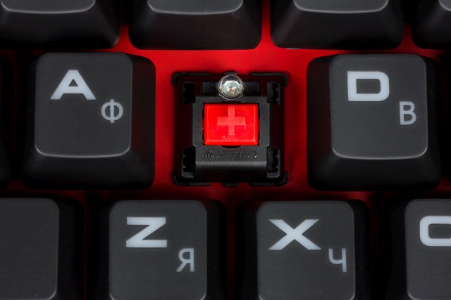 Символы латиницы высотой 3-4 мм выгравированы крупным жирным шрифтом и сдвинуты в левый верхний угол колпачка клавиши. Кириллические символы высотой 1,5-2 мм размещены чуть ниже и правее, их шрифт заметно тоньше. В целом все символы читаются без ошибок, но кириллические стоило сделать крупнее. При плохом освещении читаемости символов способствует отключаемая красная светодиодная подсветка. Светодиоды размещены по верхнему краю клавиш, поэтому и выгравированные символы на колпачках смещены к этому же краю.
