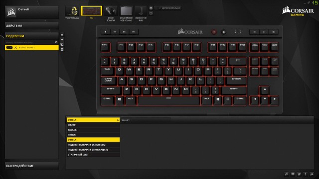 В нём можно выбрать один из режимов подсветки: визор, дождь, пульс, волна, подсветка печати (клавиша загорается при нажатии), подсветка печати (пульсация) и стандартный — статичный цвет.