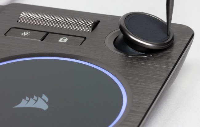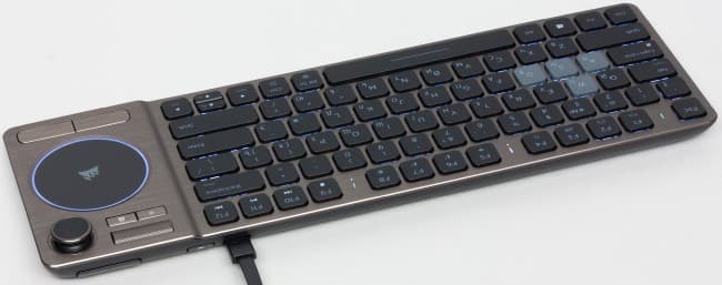 Верхняя панель клавиатуры прикрыта матовой алюминиевой пластиной тёмного цвета. Корпус сделан из пластика. В глаза сразу бросается ряд особенностей: вместо цифрового блока справа расположена сенсорная панель, под ней две кнопки, над ней джойстик, валик регулировки уровня громкости, кнопка управления подсветкой и кнопка выключения модификатора Fn.