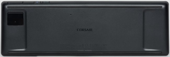 На днище корпуса размещены две прорезиненные полоски противоскольжения, а под сенсорной панелью — правая кнопка мыши. Левая кнопка мыши размещена на передней грани справа, как раз под указательный палец, если клавиатура удерживается в правой руке. Безымянный палец при этом удобно попадает на правую кнопку мыши на днище, ну а большой палец удобно располагается над сенсорной панелью. Большим пальцем без проблем можно управлять джойстиком, дотянуться до валика регулятора уровня громкости, выключить или изменить уровень яркости подсветки, отключить модификатор функциональных клавиш. До кнопок мыши под сенсорной панелью дотянуться невозможно. Собственно поэтому они и продублированы на корпусе клавиатуры. В результате пользоваться клавиатурой, точнее управлять курсором, на весу очень удобно. Удержать клавиатуру в одной ладони можно, но управлять курсором и удерживать в одной правой ладони — нереально, да это и не нужно.
