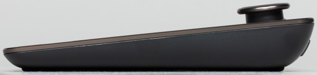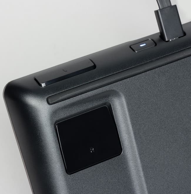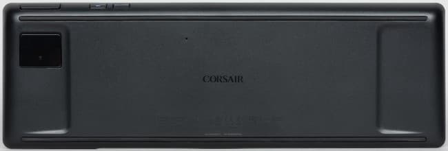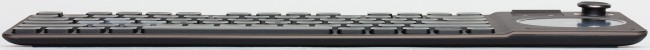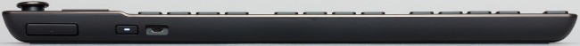 На передней грани расположен разъём microUSB для подключения к ПК по кабелю и для зарядки встроенного аккумулятора, кнопка включения/выключения клавиатуры с белым светодиодом и левая кнопка мыши. Индикатор питания светится, если клавиатура находится в режиме сна и гаснет, если связь с подключенным устройством прервалась.