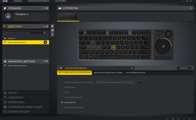 Во вкладке «Действия» можно создавать макрокоманды или действия, например запуск приложения, и назначать их вызов на одну из клавиш.
