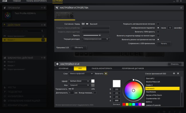 Отметим, что несколько раз при запуске iCUE мы сталкивались с тем, что приложение не видело клавиатуру и приходилось подключать её кабелем.