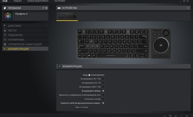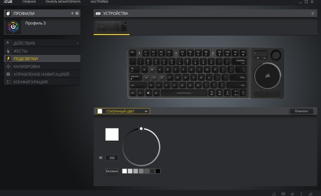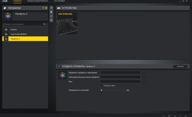 Различные настройки можно записывать в разных профилях, которые хранятся во встроенной в клавиатуру памяти. Правда, переключаться между профилями можно только в iCUE.