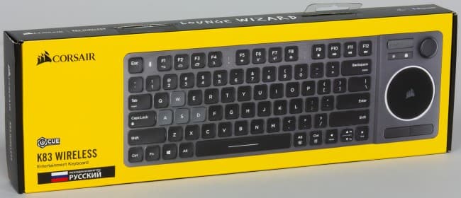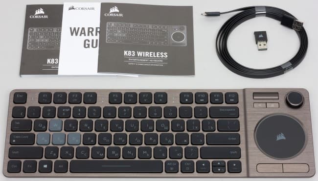 Клавиатура продаётся в компактной коробке традиционного для Corsair дизайна. В комплект поставки входит кабель USB, трансмиттер радиосигнала и руководство пользователя.