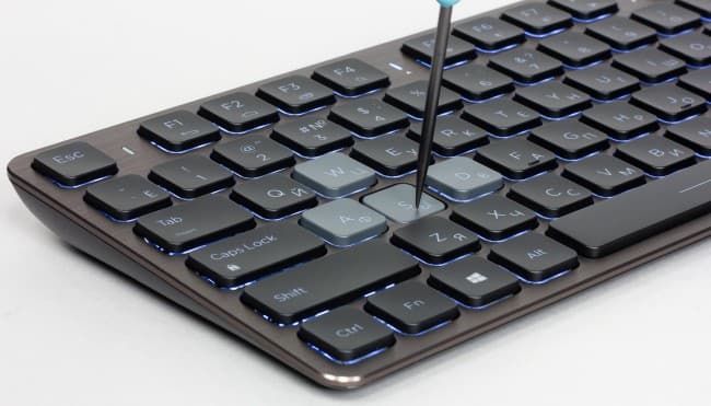 В клавиатуре применены ультранизкопрофильные переключатели с ножничным механизмом. Это позволило обеспечить тактильные ощущения при нажатии на клавиши, схожие с использованием механических переключателей. Зато уровень шума при наборе текста ниже. Свободный ход и дистанция срабатывания контакта — около 2 мм. Никакого дискомфорта это не вызывает.