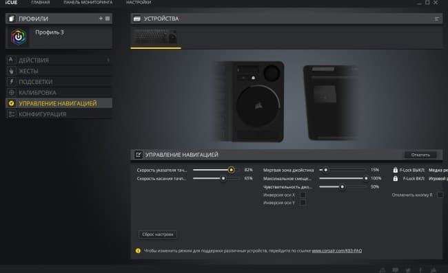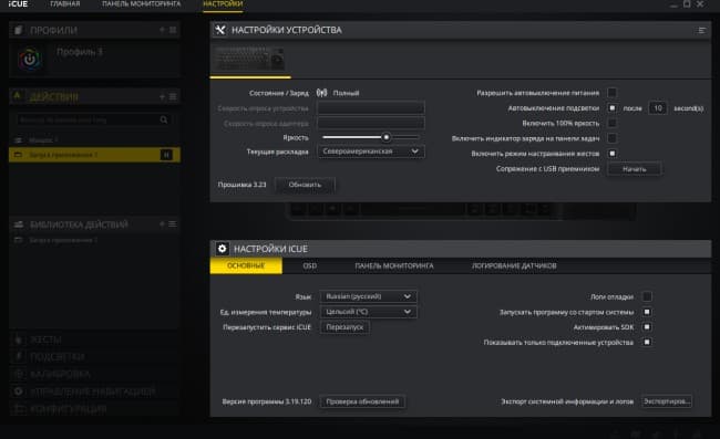 В меню «Настройки» производится обновление прошивки и приложения iCUE, а также включаются или выключаются некоторые опции.