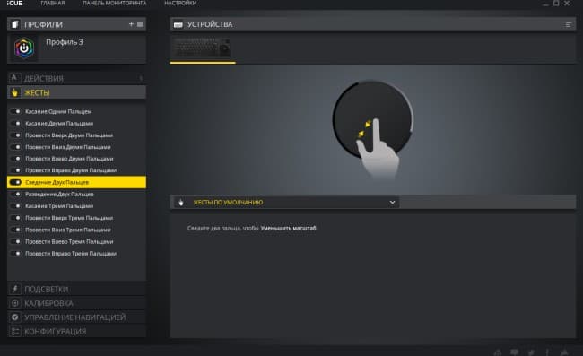 Во вкладке «Жесты» можно отключить ненужные жесты, при условии, что вы используете режим жестов через iCUE, а не Windows. Чтобы передать управление жестами обратно в Windows, нужно в разделе «Настройки» выключить «режим настраивания жестов».