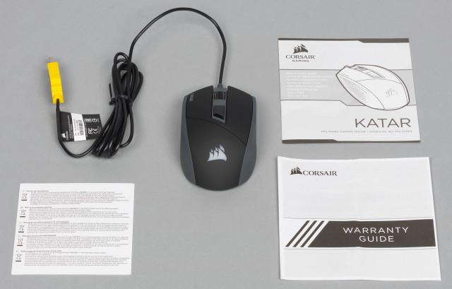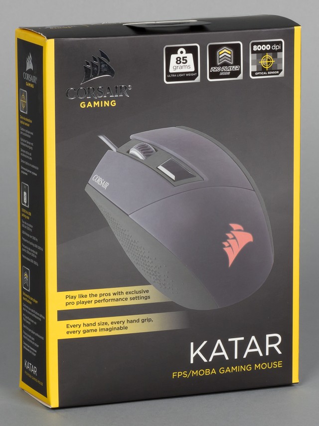 Мышка поставляется в небольшой простой картонной коробке с габаритами ~ 139×190×50 мм в традиционной для Corsair черно-желтой цветовой гамме. На фронтальной части изображена сама мышка, перечислены ключевые особенности — малая масса, настройки профессиональных игроков и оптический сенсор с разрешением 8000 dpi. Кроме того, заявлено, что мышь подойдет для любого хвата и рук любого размера. На задней стороне упаковки также размещена фотография мыши Katar с указанием на четыре, пояснением, для чего служит кнопка за колесом прокрутки, и описанием преимуществ прорезиненного покрытия. В нижней части приведено высказывание киберспортсмена о том, что мышь Katar это то, что ему нужно. На правом и левом боках коробки расписаны ключевые особенности мышки и важные технические параметры.