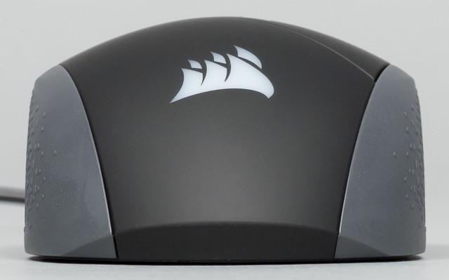 На задней части мышки красуется логотип Corsair в виде стилизованных парусов, которые светятся только одним красным цветом, а режим работы и яркость светодиода можно менять через CUE.