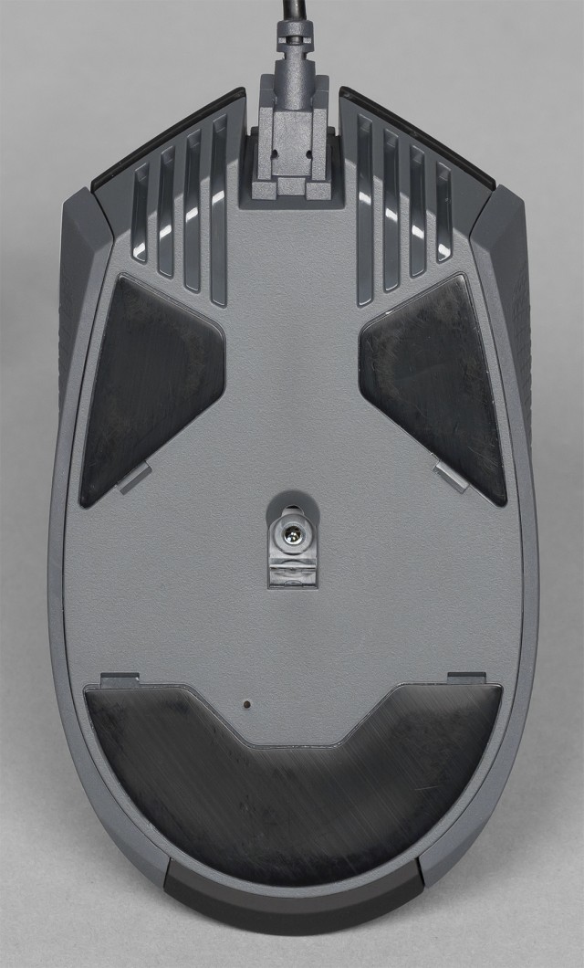 Интерфейсный кабель имеет покрытие из ПВХ, которое никак не предотвратит скручивание и растяжение, но зато стоит дешевле текстильной оплетки. На нижней поверхности мыши есть три опорные площадки из материала PTFE, идентичного покрытию Teflon, что способствует легкому скольжению по различным поверхностям. Во время тестов мы использовали Corsair Katar на текстильном и алюминиевом ковриках, и претензий к скольжению у нас нет.