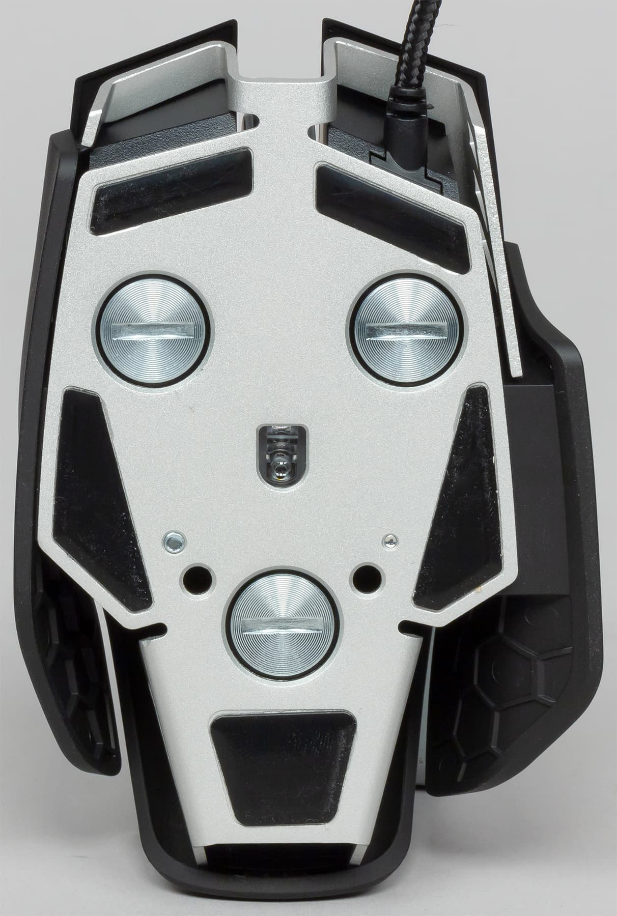 Основа корпуса мыши выполнена из алюминия. В нижнюю панель вкручены три винта под широкий шлиц, их легко выкрутить и вкрутить при помощи, например, обычной монеты.