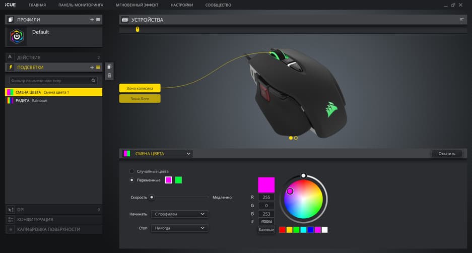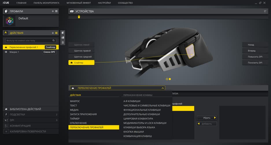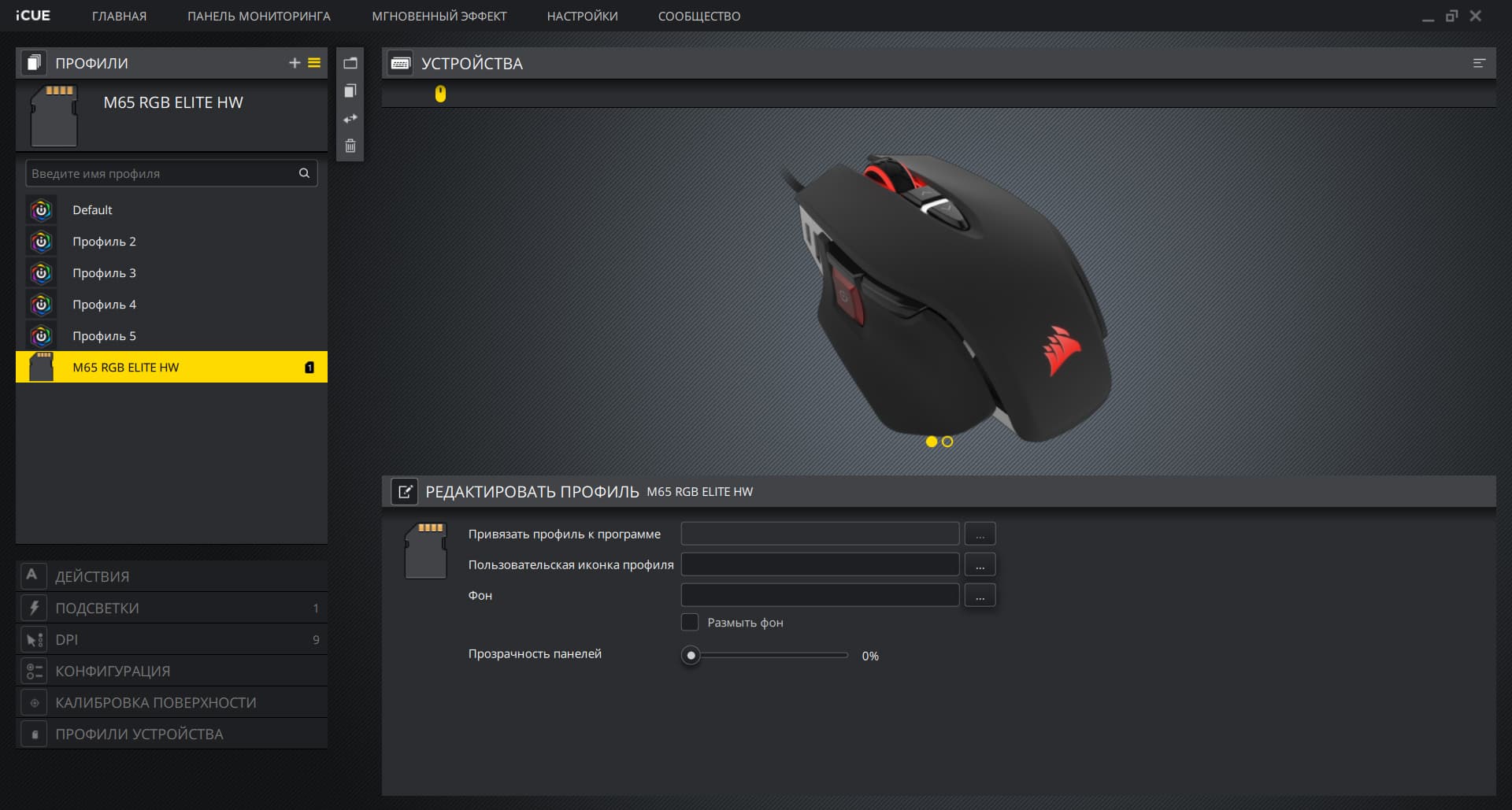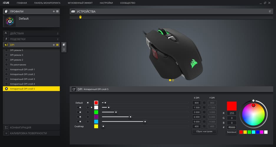 Мышь настраивается при помощи фирменного ПО Corsair — программы iCUE. Как обычно, здесь можно использовать встроенные профили или создавать собственные.
