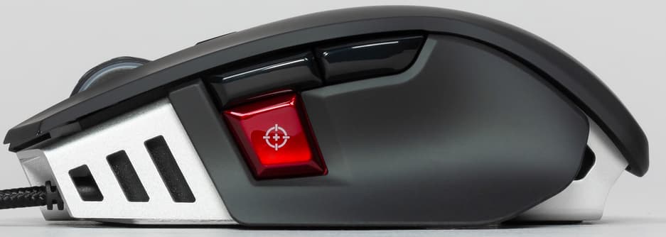 Боковые панели манипулятора сделаны из шершавого матового пластика без привычных резиновых накладок. Левая панель отстаёт в сторону, образуя выступ для большого пальца. На ней расположены две навигационные кнопки и отдельная кнопка, которую производитель называет «кнопкой снайпера». По умолчанию она предназначена для переключения CPI в режиме «hold on»: когда она зажата, действует снайперское разрешение, когда отпускается — CPI возвращается к исходному. Кнопка резко выделяется красным блестящим пластиком и нарисованным на ней перекрестием прицела. Во время игры она удобно лежит под большим пальцем, а размер кнопки позволяет безошибочно угадывать её на ощупь и не промахиваться.