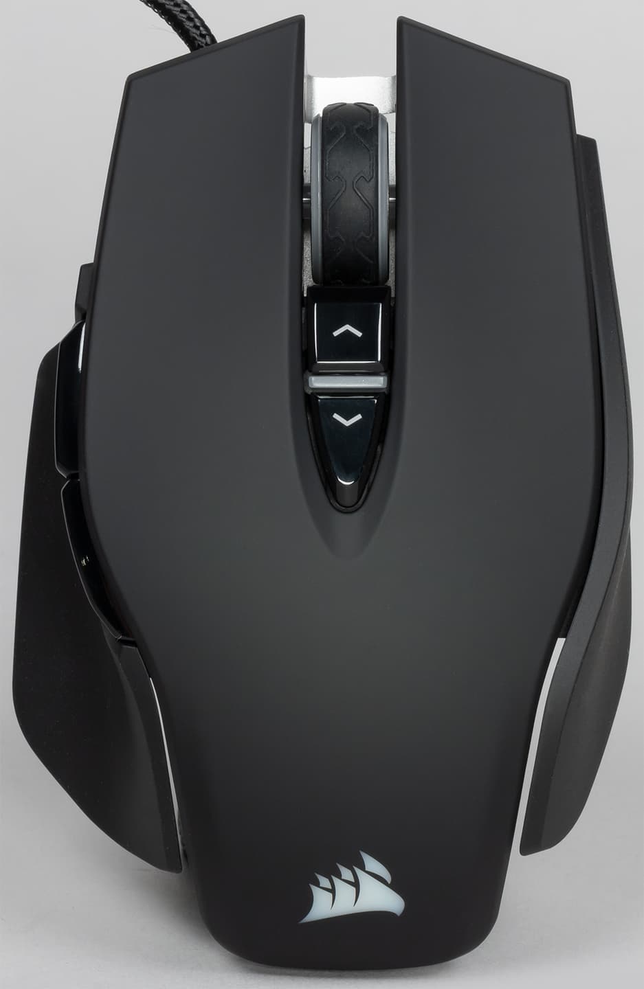 Между кнопками находится светодиодный индикатор, цвет которого зависит от выбранного режима CPI. На тыльной стороне верхней панели находится подсвеченный логотип фирмы Corsair.