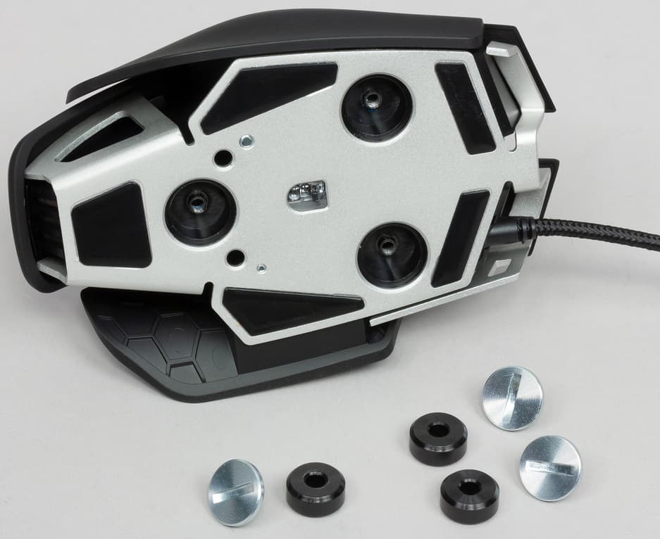 Каждый винт крепит к нижней панели манипулятора грузик в виде шайбы весом около 6 граммов. Таким образом, снимая или надевая грузики, можно менять балансировку и вес мыши от 97 до 115 граммов. Правда, никакой коробочки для хранения грузиков в комплекте нет, и это изрядно увеличивает шанс потерять неиспользуемые.