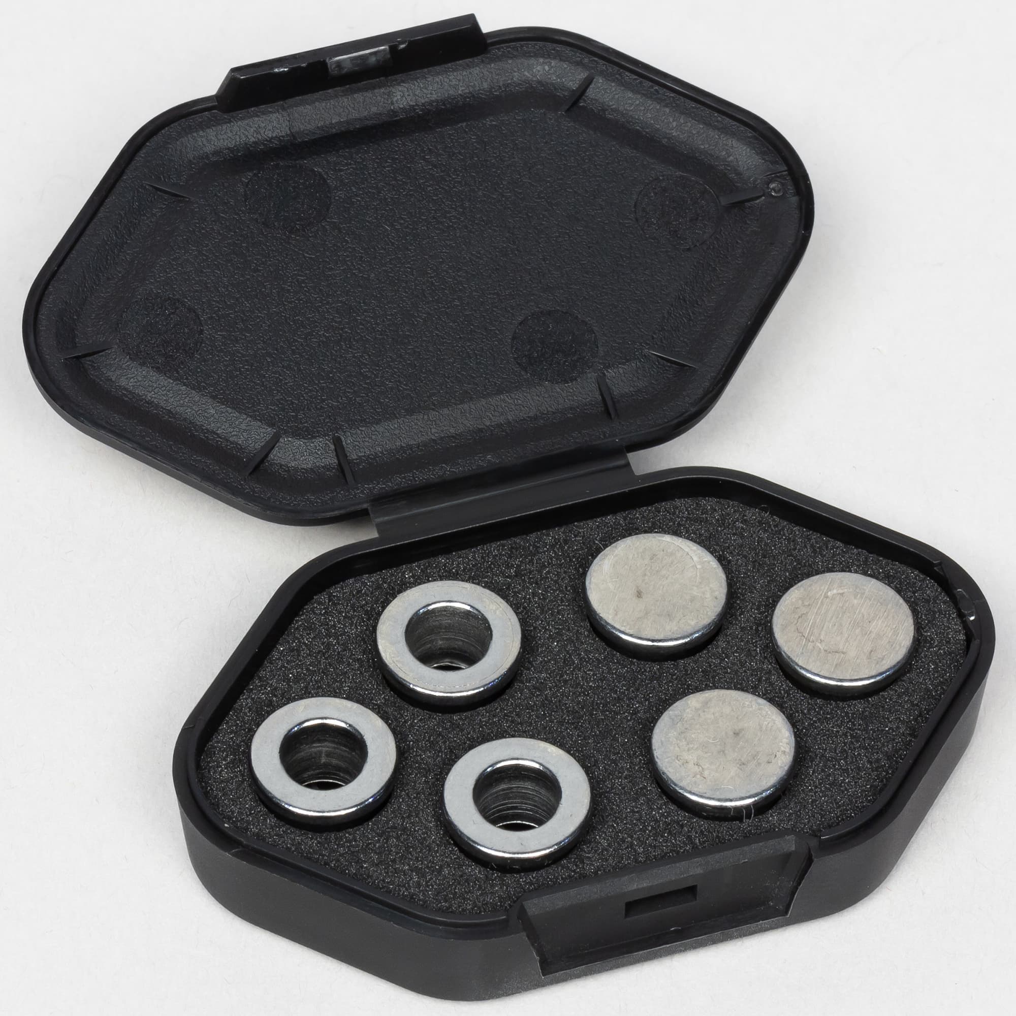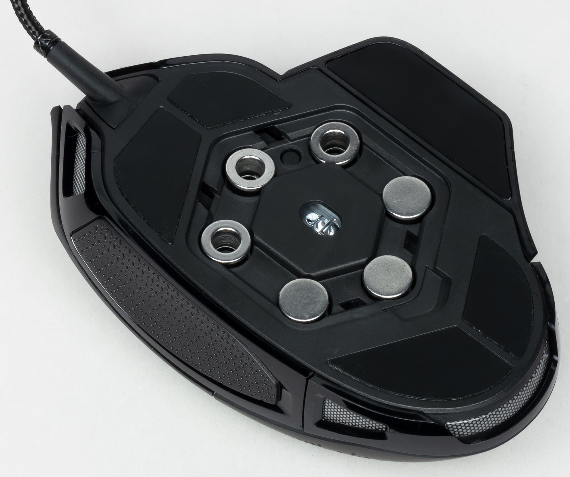 Настройка веса Nightsword реализована проще, чем в другой мыши Corsair — М65. Здесь не нужно ничего откручивать, достаточно открыть пластиковую крышку на нижней панели. Грузики позволяют менять вес мыши от 119 до 141 грамма. Более того, мышка определяет, какие грузики и в каком порядке вы поставили — в гнёздах стоят специальные сенсоры. В комплекте в пластиковом кейсе есть по три грузика на 4,5 грамма и на 2,8 грамма.