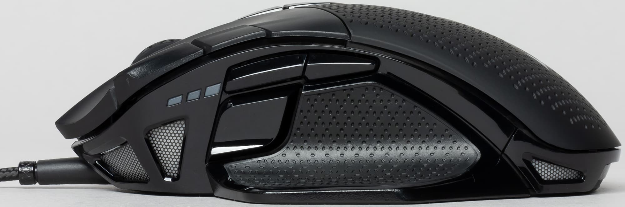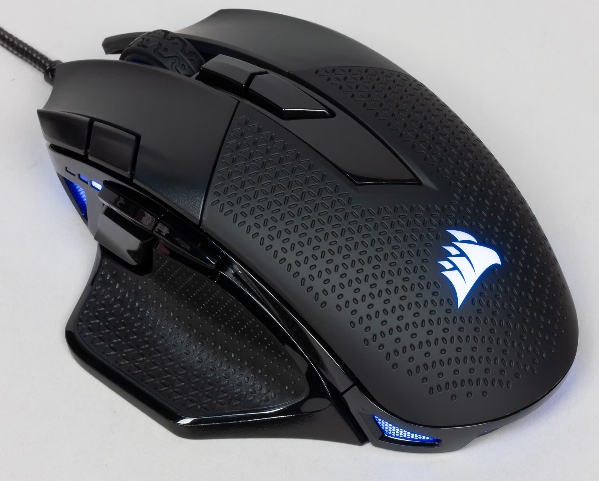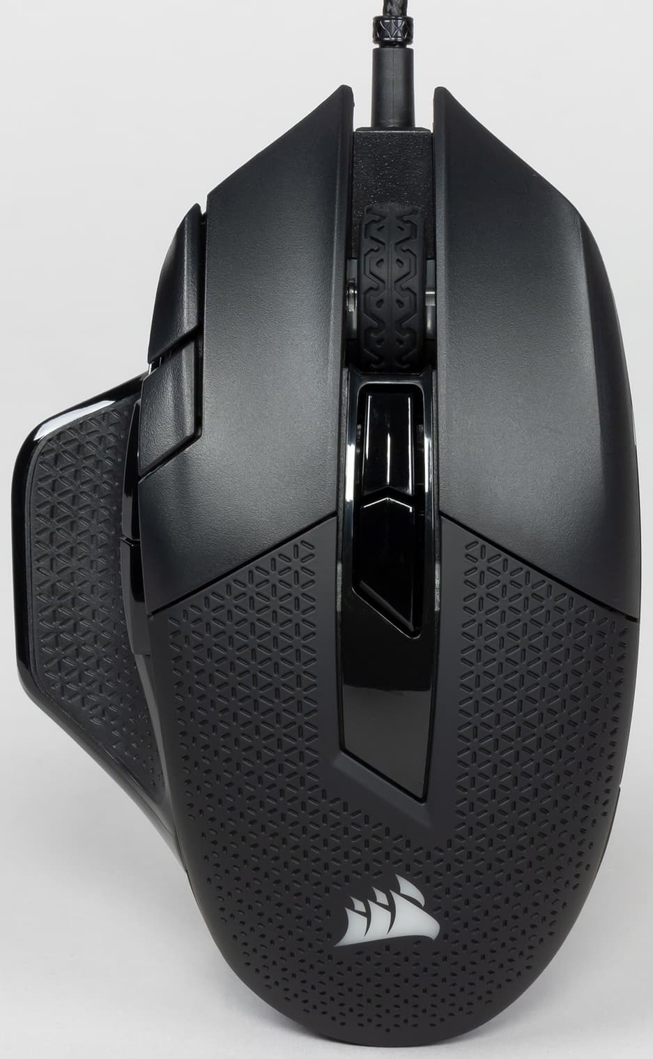 Манипулятор сделан для правшей и предназначен для ладонного хвата, но можно его держать и пальцами, а вот когтем — совсем неудобно. Колёсико широкое, с резиновой накладкой, на дискретном механизме. В отличие от многих корсаровских мышей не издаёт характерного шума при вращении и тряске, да и вообще ведёт себя достаточно тихо.