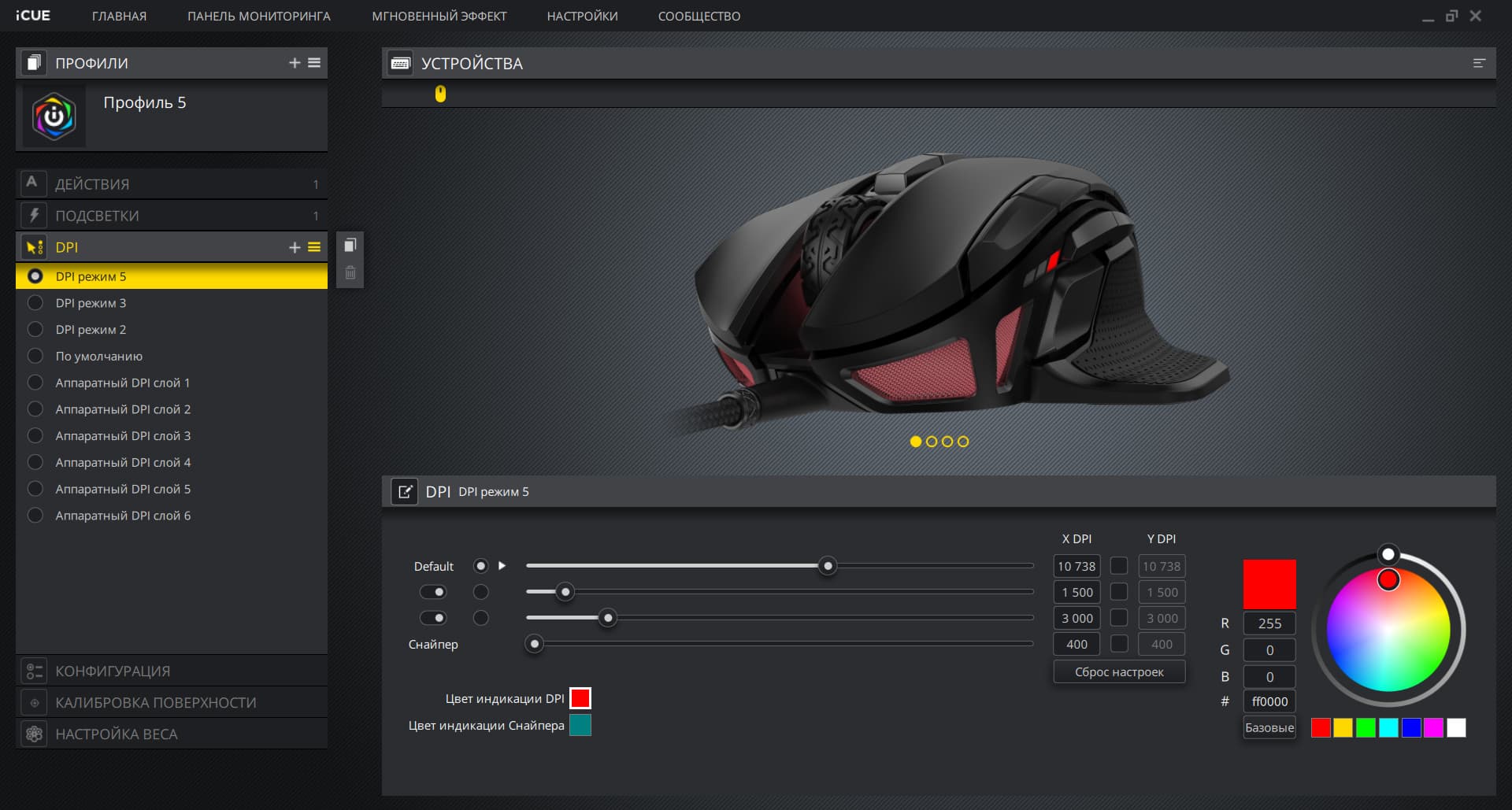 Для DPI нам предлагают настроить три значения, которые соответствуют светодиодам на индикаторе. Его цвет как для стандартных режимов, так и для «снайперского» тоже настраивается.