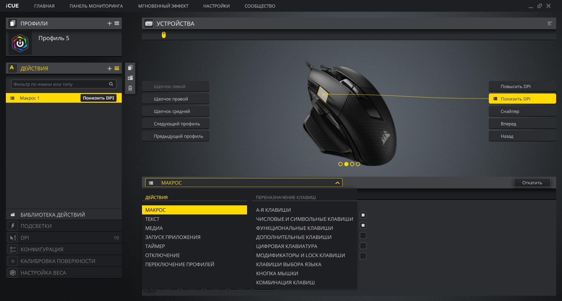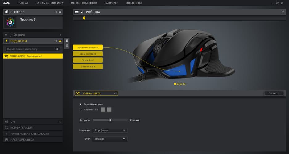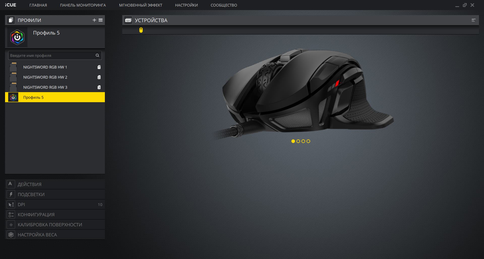Ну и далее всё стандартно. Есть возможность выбрать один из трёх встроенных профилей или создать безумное количество своих собственных. Кстати, пользовательские профили переключают кнопки на корпусе, на заводских профилях в режиме подключения через фирменное по физическое переключение не работает. Другое дело при подключении манипулятора к компьютеру без iCUE. Встроенные профили мыши хранятся в её собственной памяти, их можно кастомизировать, и тогда теоретически программу iCUE можно при желании удалить с компьютера, мышь всё равно будет работать так, как вы её запрограммировали.