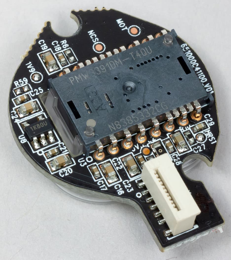 Внутри у грызуна стоит сенсор PMW 3391 от PixArt. Сенсор имеет физическое разрешение до 18 000 DPI, которое можно настроить с шагом в 1 пункт (если это зачем-то нужно и если позволяет монитор, у меня на 16 дюймах в Full HD на минимальной чувствительности получалось двигать ползунок с шагом в 29 пунктов), просчитывает отрыв от поверхности до 3 мм и выдерживает ускорение до 50 G. Скорость отслеживания сенсора составляет 400 IPS. На сегодняшний день этот сенсор один из топовых в сегменте. Однако такие высокие значения DPI нужны по большому счёту лишь обладателям огромных мониторов с очень высоким разрешением.