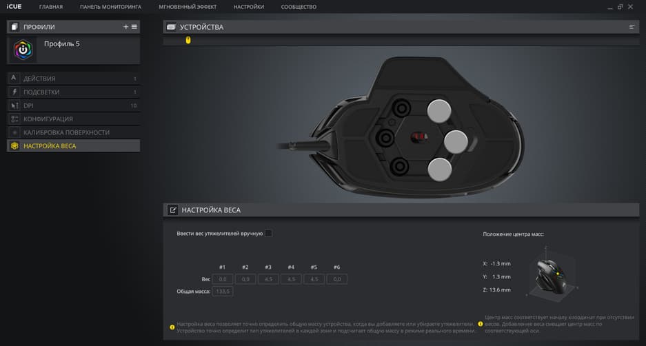Программно мышка настраивается при помощи фирменного ПО iCUE. Однако помимо классического набора здесь есть интересное новшество, о котором я уже упоминал. Мышка отслеживает, какие грузики и в какие слоты вы поставили, и выдаёт информацию не толькоо массе, но и о балансе.