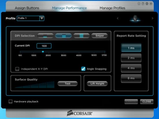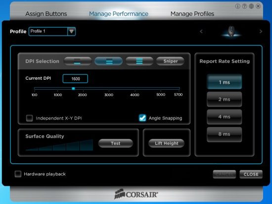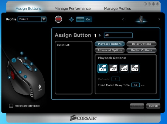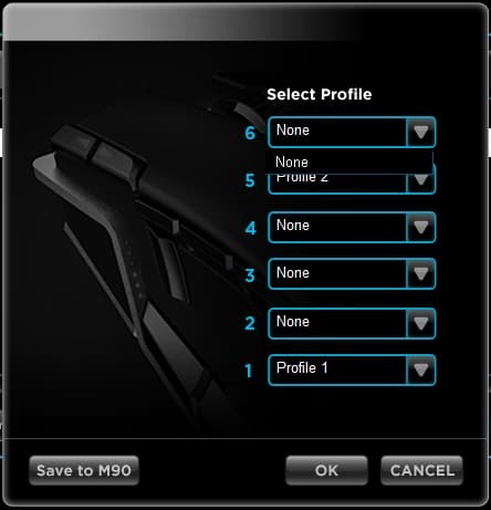 Важной опцией является Software/Hardware Playback, которой в 23-страничном мануале к мышке (!) M90 посвящено две страницы. В первом случае пользовательские настройки мыши считываются из приложения, работающего через буфер клавиатуры Windows. В нем возможно назначать неограниченное количество профилей для разных приложений. Во втором случае число профилей ограничено шестью, но они считываются напрямую из памяти мыши и показываются индикатором. Разумеется, отсутствие привязки к буферу лишает пользователя некоторых проблем, так что использование первой опции имеет смысл лишь если вы используете более шести профилей. Что в действительности выглядит маловероятным.