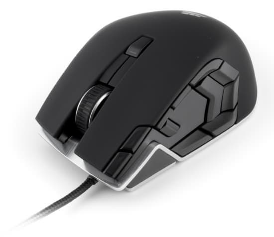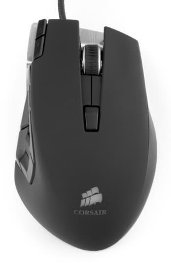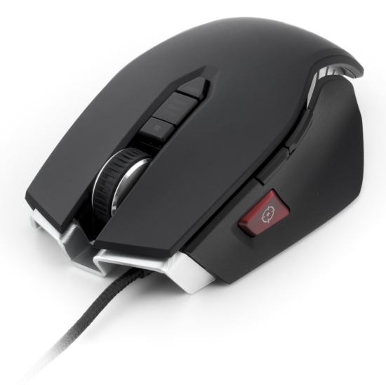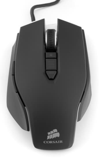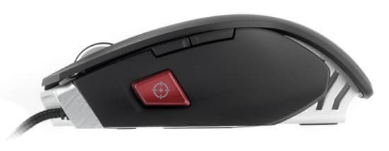 На левой грани расположена пара незаметных кнопок для большого пальца, а также крупная красная кнопка «Sniper» с изображением прицела — ноу-хау Corsair.