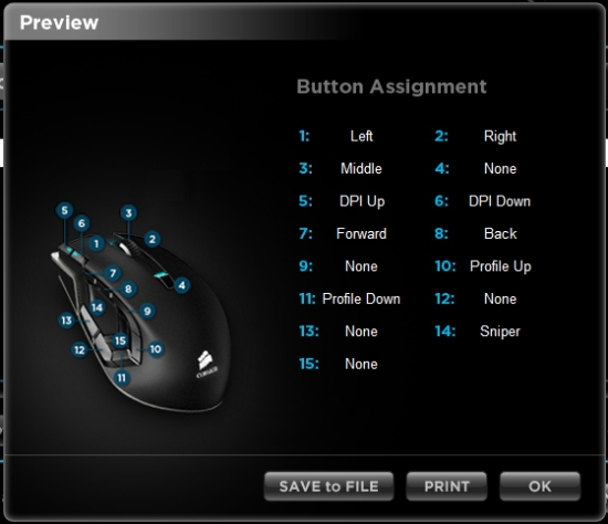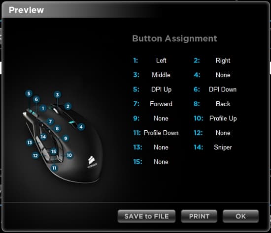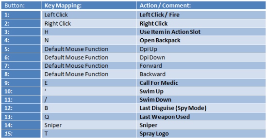 Что касается M90, то она, мягко говоря, пресыщена элементами управления. Как мы уже упоминали, их насчитывается 15 (не считая прокрутку колесика) — вполне достаточно, чтобы вместить алфавит какого-нибудь не обремененного прогрессом племени. Особые надежды возлагаются на большой палец, которому в одиночку приходится справляться c девятью из них. Если вы не в силах самостоятельно придумать команды для всех кнопок, Corsair уже позаботилась об этом, подготовив 12 профилей. Вот как выглядит один из них, для Team Fortress 2: