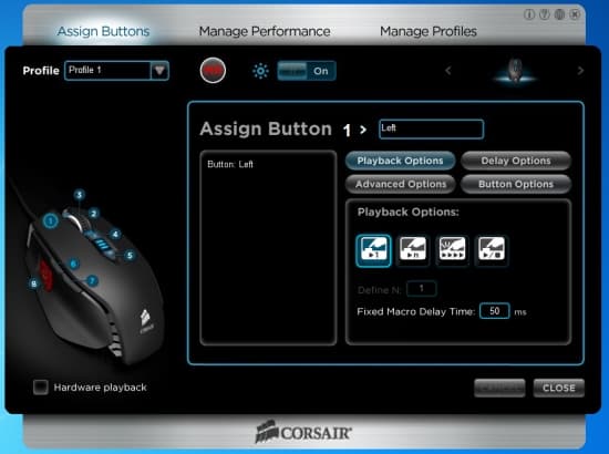 Все возможности программной настройки распределены по трем окнам. В первом назначаются команды для клавиш, пишутся макросы, переключаются профили. Все это организовано довольно неудобным образом, и разобраться без помощи мануала, размещенного на сайте Corsair, нелегко. При помощи ползунка здесь можно включить/отключить подсветку колесика.